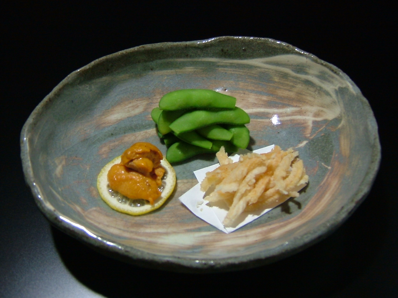 酒の友三種(枝豆・雲丹塩漬け・骨煎餅)