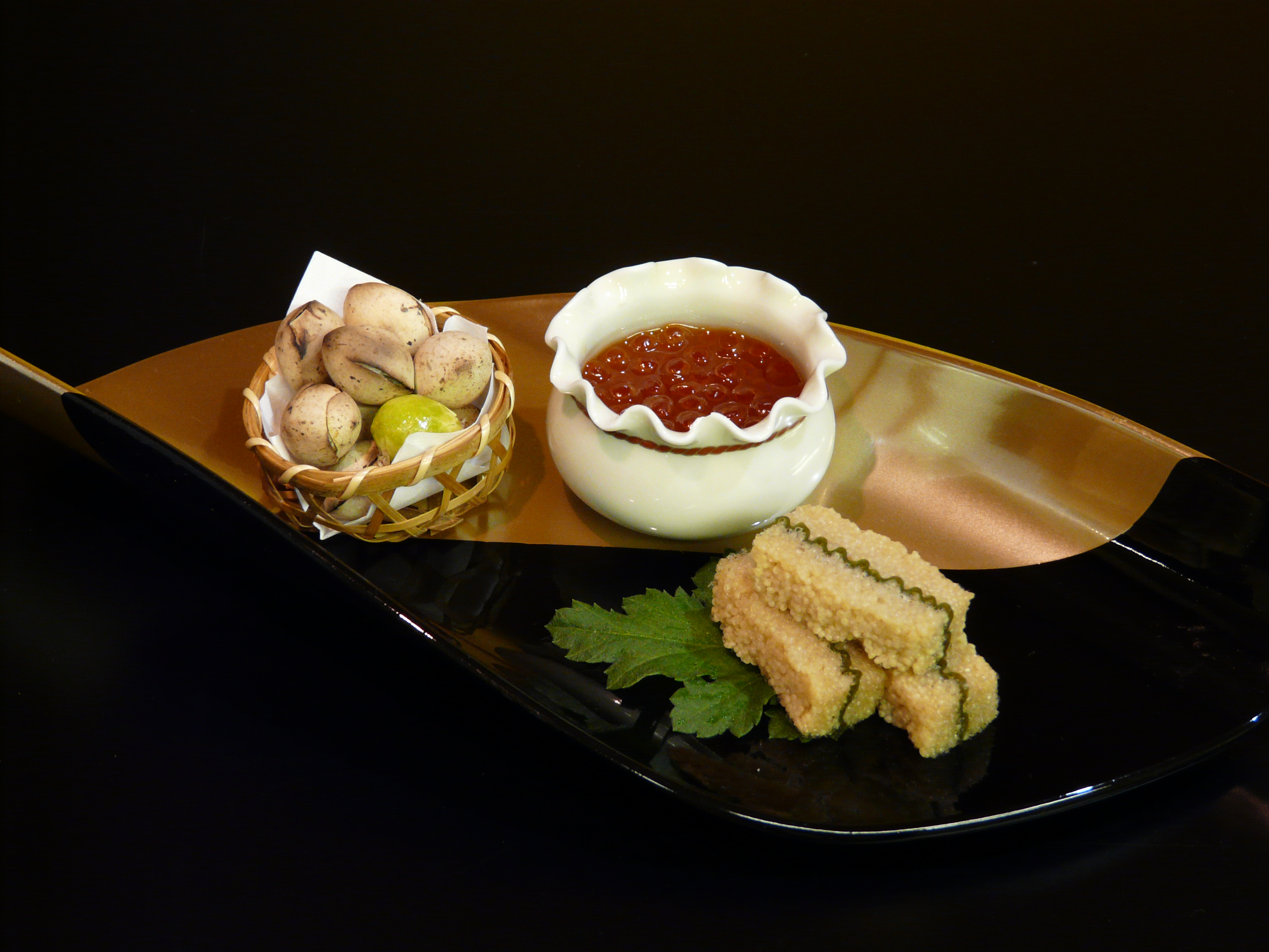 酒の友三種(煎り銀杏・子持若布・筋子醤油漬け)