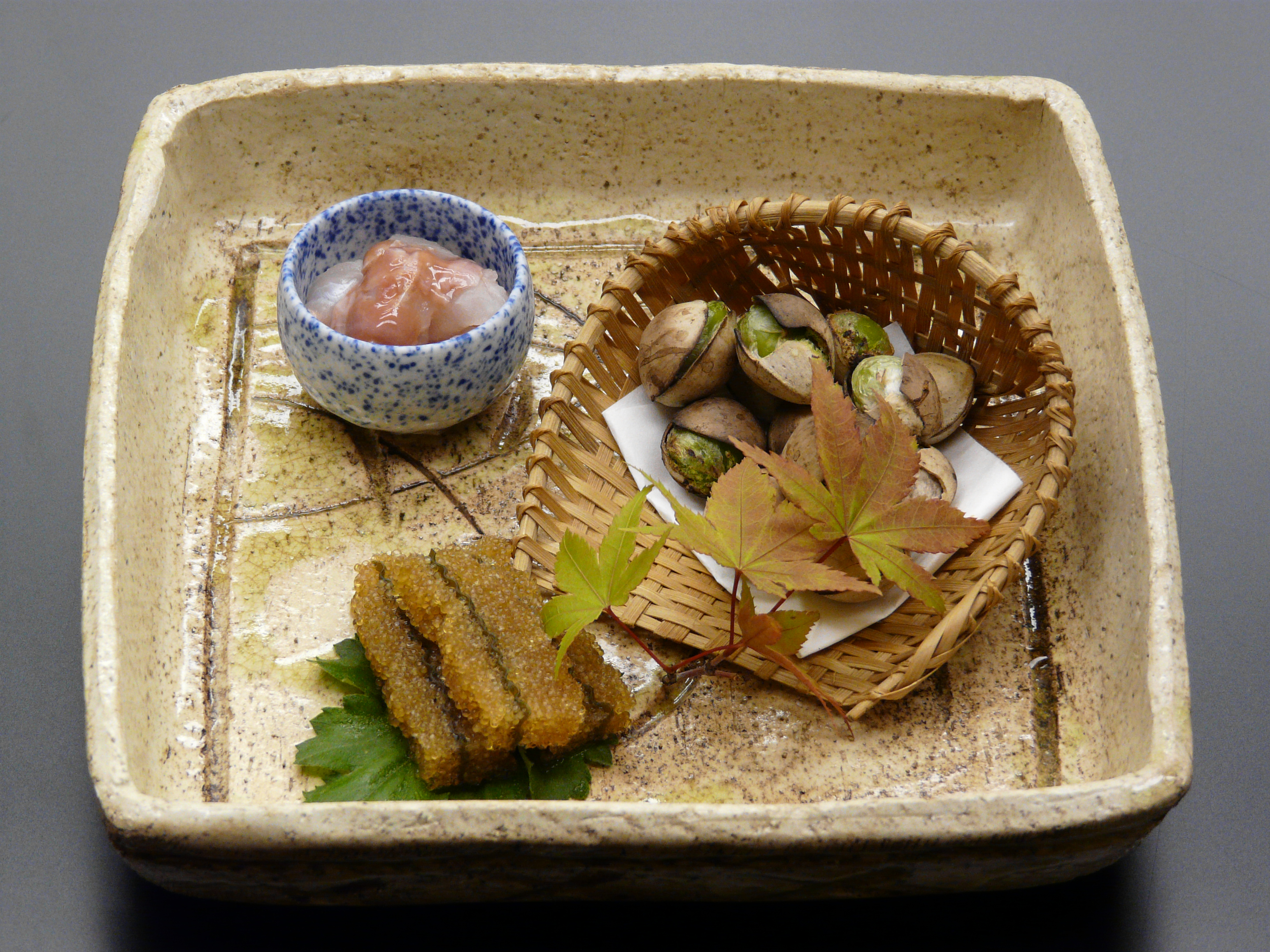 酒の友三種(煎り銀杏・白身魚酒盗和え・子持若布)